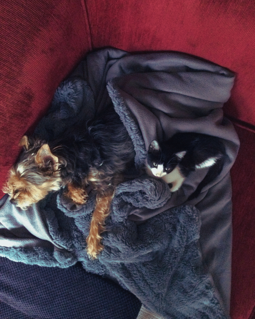 Two days of bathroom quarantine. Flea treatment. Then de-worming and slow introduction to other parts of the house. Weight gain. Playfulness. Moments of sneaking over to snuggle the dog while she sleeps.